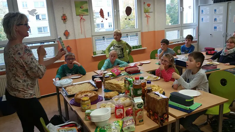Denn an diesem Tag sollte sich für die Klassen 3A und 3B mit dem Apfelprojekt alles um jene Frucht drehen. Eingestimmt wurde sich dabei zunächst einmal mit einigen Herbstliedern. Anschließend erfuhren die Kinder von einer Vertreterin des Elbbiosphärenreservats eine Menge Wissenswertes über die verschiedensten Apfelsorten.