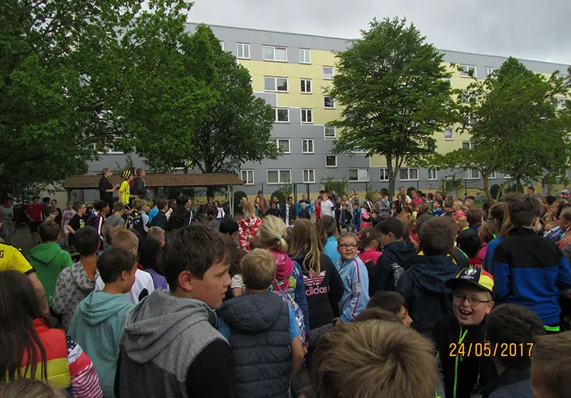 Am 24.5.2017 trafen sich alle Schüler, Lehrer und Helfer auf dem „Friedrich-Ludwig-Jahn- Sportplatz. Die Schüler hatten mit ihren Eltern einen Betrag vereinbart, den diese pro Runde zahlen wollten. Und die Kinder liefen und liefen und liefen.