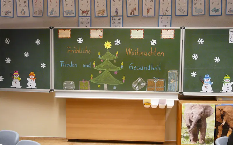 Im Folgenden erwartete die Klasse im Frühstücksraum der landwirtschaftlichen Produktionsgenossenschaft dann eine dicke Überraschung: Es gab ein üppiges Frühstück samt Milch, Kakao, verschiedenen Frischkäsesorten, Wurstbroten, Mandarinen und so mancher Nascherei unter dem geschmückten Tannenbaum.