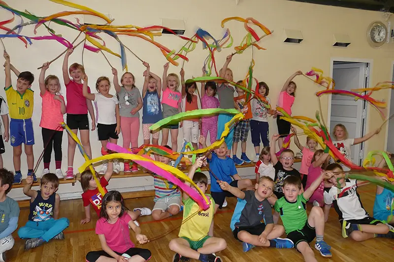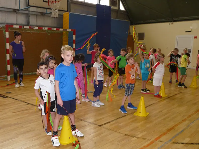 Die Klassen Flex A und 1d trainieren mit ihren selbstgebastelten gymnastischen Bändern.