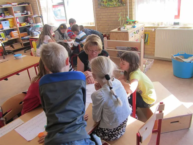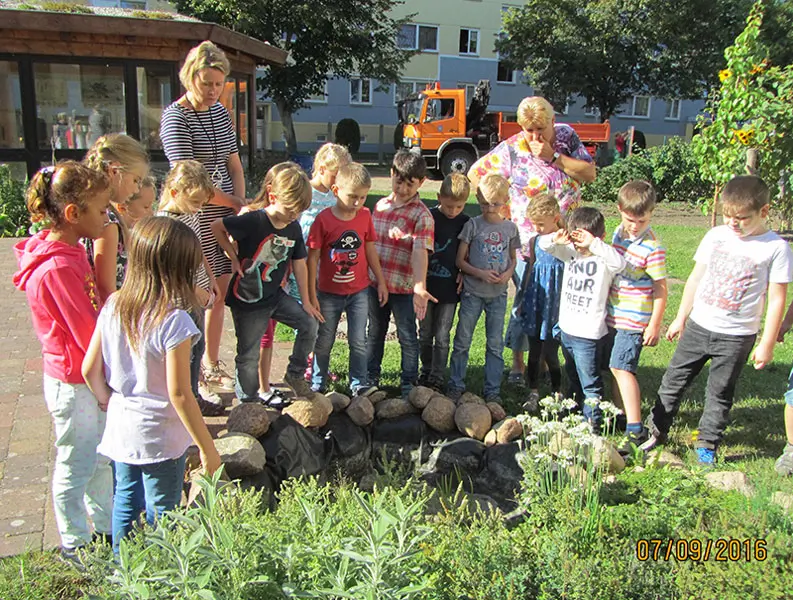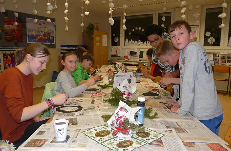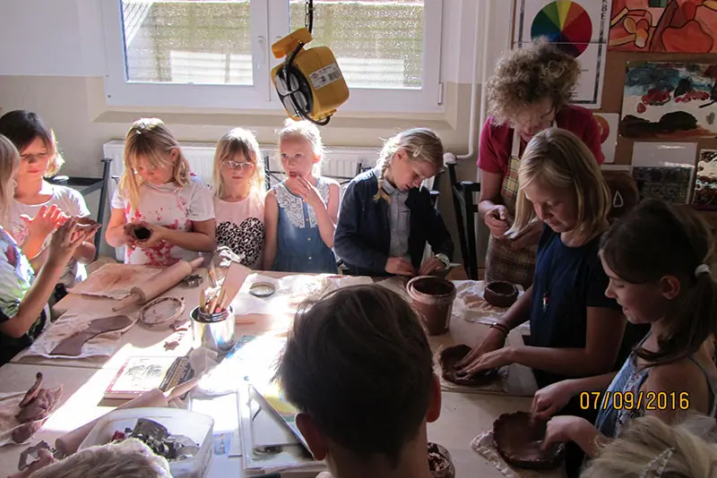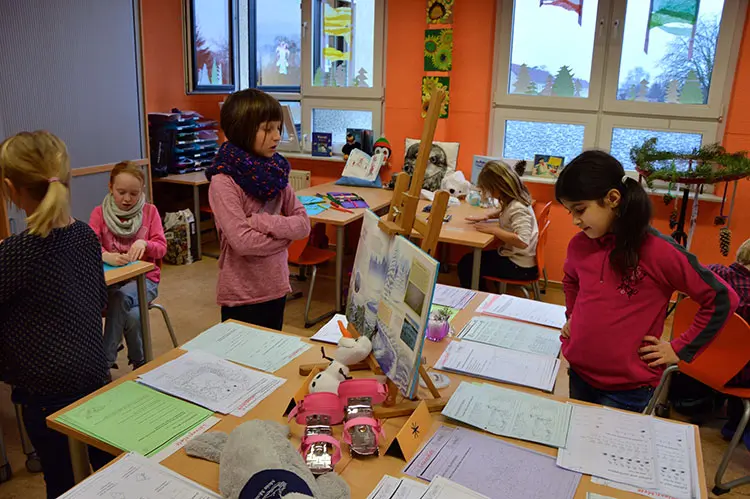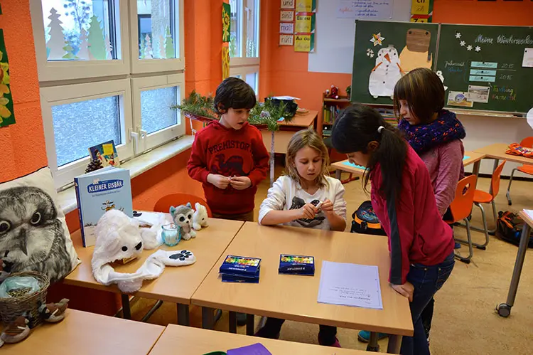Kinder der ersten Klassen legen aus Naturmaterialien, kleben aus Schnipseln und kneten gelernte
